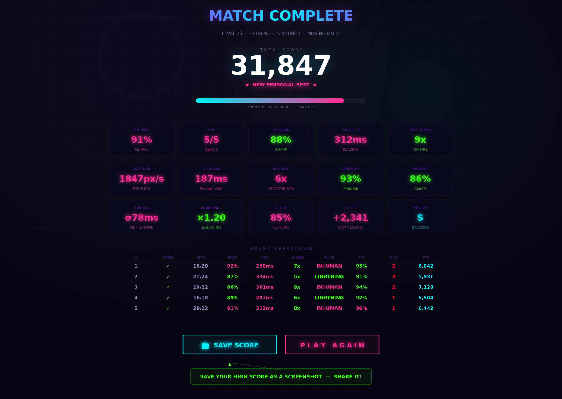 MATH AIM combines fast-paced aim training with mental math challenges. Each round presents a math problem — your answer spawns targets. Then it's shooting time. Train your brain and reflexes simultaneously.